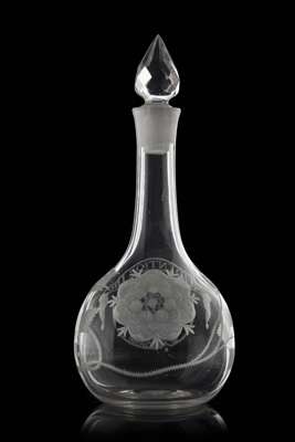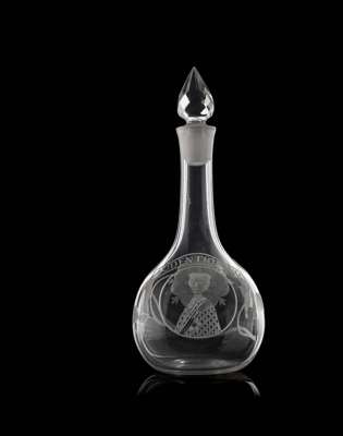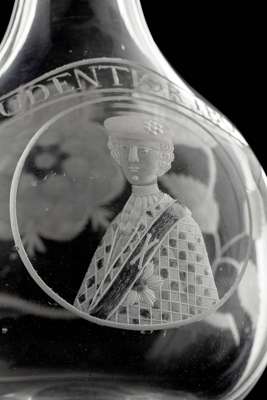 Notes: While Jacobite glasses of all forms are well recorded, including those scarce examples with portraits, the survival of Jacobite decanters such as this in any form is extremely rare. This particularly fine example is not only rare with respect to the  quality of the engraving and iconography but more so in the use of such an overt portrait of Prince Charles Edward Stuart.