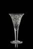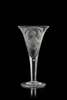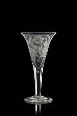 the drawn trumpet bowl finely engraved with profile portrait of Prince Charles Edward Stuart within a laurel leaf cartouche with ribbon above inscribed 'AUDENTIOR IBO' with oak leaf spray below, the reverse with large display of an engraved open rose flanked by open and closed bud and thistle within rose leaves, on a tapered plain stem with tear drop air bubble, the domed foot with engraved Prince of Wales feather and folded foot