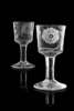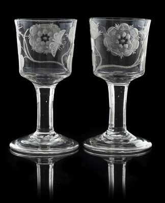 the bucket bowls slightly tapered engraved large displayed rose head flanked by open and closed buds, the reverse with moth, on a large straight stem with domed foot with folded rim (2)