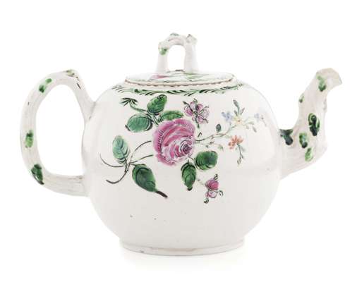 of bullet form with polychrome enamels with portrait of Prince Charles Edward Stuart within laurel garland cartouche, flanked with thistle and white rose, the opposing side with rose and floral bouquet, with naturalistic branch handle and spout with green enamel details, the pull off cover with branch finial and thistle, rose and bud