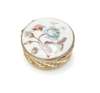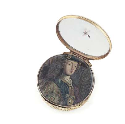 of simple circular outline, the ormolu body with inswept sides and simple repeating linear panels, the hinged cover set with domed porcelain plaque with fine representation of white rose buds with butterfly, two moths above and a caterpillar in foliage below, opening to reveal a second inner cover with reverse painted on glass portrait of Prince Charles Edward Stuart, the base of the box set with finely formed radiating panel of pressed tortoiseshell