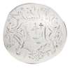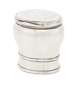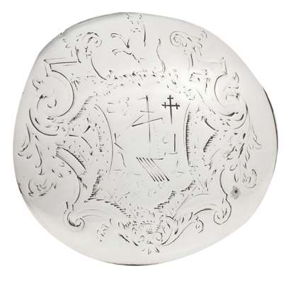 unmarked, the baluster body with simple reeded girdle and foot rim, the hinged cover with scroll thumb piece and engraved armorial of Cluny MacPherson within foliate scroll formed cartouche