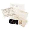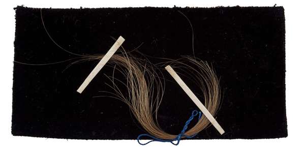 the small lock of hair pinned to a velvet pad, contained in an envelope, with various hand written notes and description