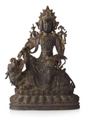 BRONZE FIGURE OF AVALOKITESHVARA SEATED ON A MYTHICAL BEAST