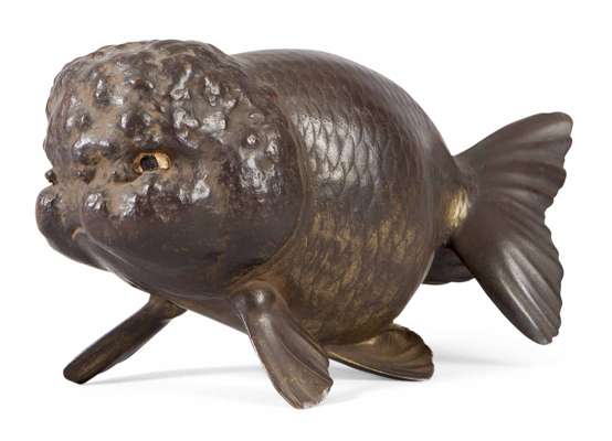 JAPANESE BRONZE FIGURE OF A BUBBLE EYE GOLDFISH