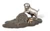 modelled as a playful puppy standing with one foot resting on a partially buried roof tile, a silver and shakudo snail crawling over the base, gilt bronze bamboo leaves growing beneath the tile, gilt Shoun seal mark