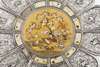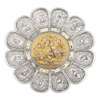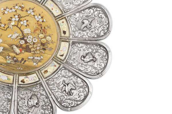 of twelve-lobed white metal form and supported on three lobed feet, the lobes decorated with silver filigree scroll work each with an applied silver panel depicting birds in flight, all ending in small rectangular ivory panels with inlaid mother of pearl floral decoration surrounding a central circular gold lacquer panel inlaid with ivory, mother of pearl, and coral with two mandarin ducks beneath a blossoming tree amongst chrysanthemums and peonies