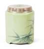 decorated with bamboo on a pale green ground, the cover pierced and with a green fern on a pale brown ground simulating tree rings, the base inscribed in enamel for anniversary, with the original storage box inscribed by Ando Jubei