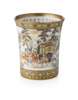 of cylindrical form with flaring mouth rim, the exterior richly decorated with a procession scene in a forest against a backdrop of mountains, the interior inscribed with the Chinese poem 'Blossoms on a Moonlit River in Spring', bearing the mark of 'Kutani, Seigado'