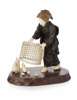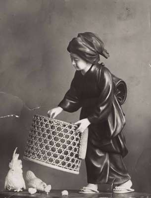 realistically carved as a woman dressed in peasant clothing with a simple kimono and a headscarf covering her hair, holding a basketweave cage and bending forwards in an attempt to catch a cockerel, chicken and three chicks, all on wooden base, signed with seal on the obi to the back of the figure