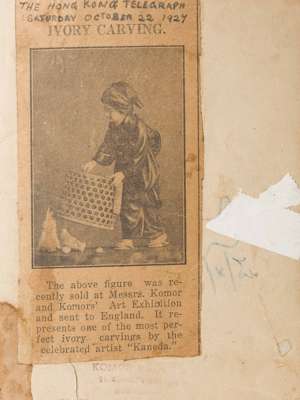 This lot is accompanied by a newspaper cutting from The Hong Kong Telegraph dated Saturday October 22nd, 1927. The figure is said to be leaving Hong Kong for England, after having been bought at Komor and Komors' Art Exhibition. It is described as "one of the most perfect ivory carvings by the celebrated artist "Kaneda"'.