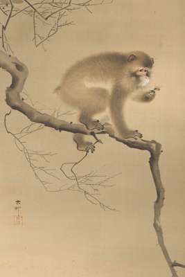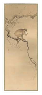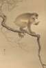 ink and colour on silk, depicting a monkey on a tree branch playing with a honey bee in its left hand, signed and framed