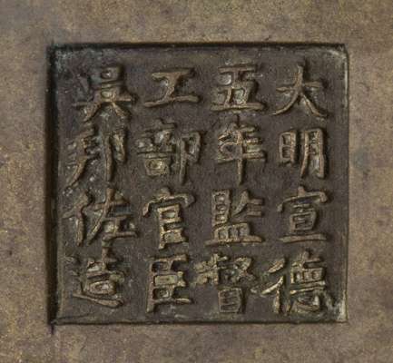 the curving body raised on a slightly flaring foot, flanked on each side by an elephant-head handle, the base bearing a sixteen-character mark reading 'Da Ming Xuan De Wu Nian Jian Du Gong Bu Guan Cheng Wu Bang Zuo Zao' (made by Wu Bangzuo in the fifth year of Xuande period)