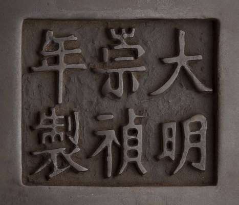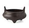heavily cast with two loop handles rising at a slight angle from the rim to the waisted neck and compressed globular walls, supported on three feet, the base bearing a six-character Chongzheng mark