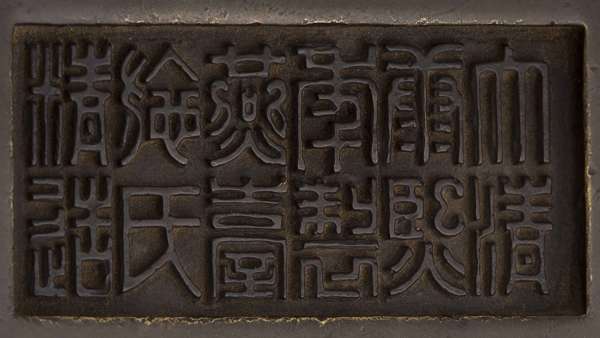 heavily cast and raised on four bracket feet, the rectangular body flanked by a pair of handles in openwork, the base with twelve- character mark within a square reading 'Da Qing Kang Xi Nian Zhi Yan Tai Shi Shi Jing Zao'