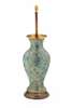 decorated all over with scrolling lotus and leaves on a blue ground, the gilt metal rim framed by a lingzhi border, on a later raised pierced foot, the internal base missing, with lamp fitting
