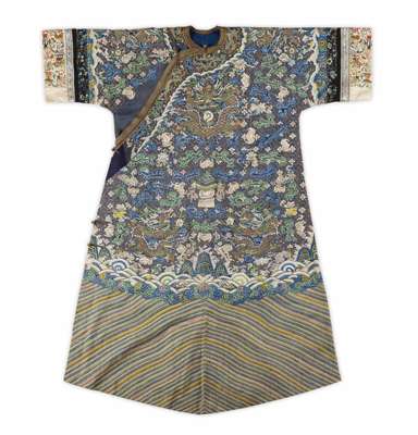 decorated with eight dragons on a blue ground with gold trellis and interspersed with swastikas, bats, fish, and other auspicious symbols, all above a cloud and wave ground, with dragon-fish peeking out of the waves, the sleeve bands embroidered with flowers and precious things