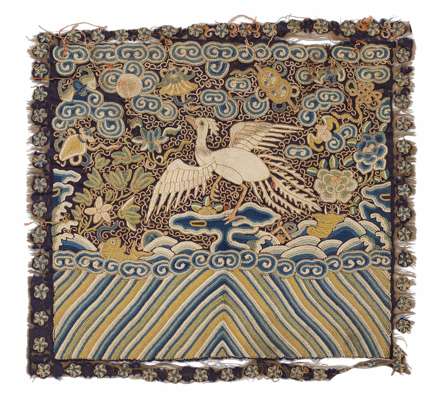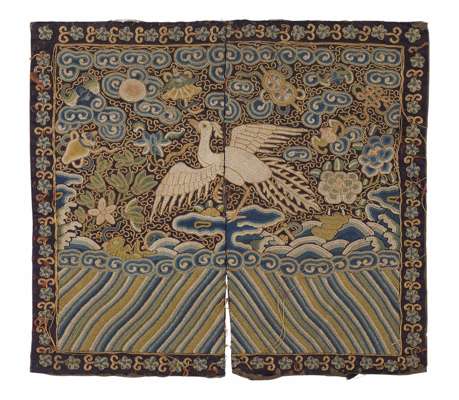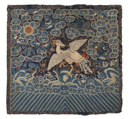 worked in gilt metallic thread against a dark blue ground, depicting a bird among clouds (5)