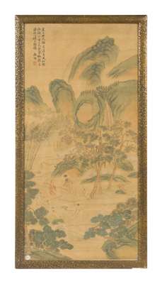 hanging scroll, framed, depicting a group of scholars discussing poetry by a river in mountainous landscape with pavilion, bamboo and prunus trees and a waterfall, inscribed and signed to upper left corner