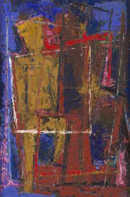 oil on board, dated (upper left), signed LAI TONG in Pinyin, an abstract composition consisting of brown, red, purple, black and pink colour patches applied in an impasto fashion, thick lines outlining rectangular fields tilted in different angles and intersecting each other against a purple ground, framed