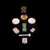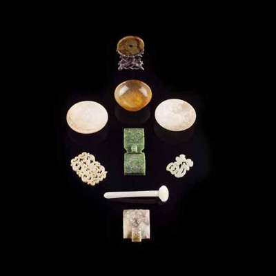 comprising; a carved disc on stand; a green belt buckle; a carved belt buckle; three carved ornaments; a yellow bowl; and a pair of dishes (9)