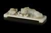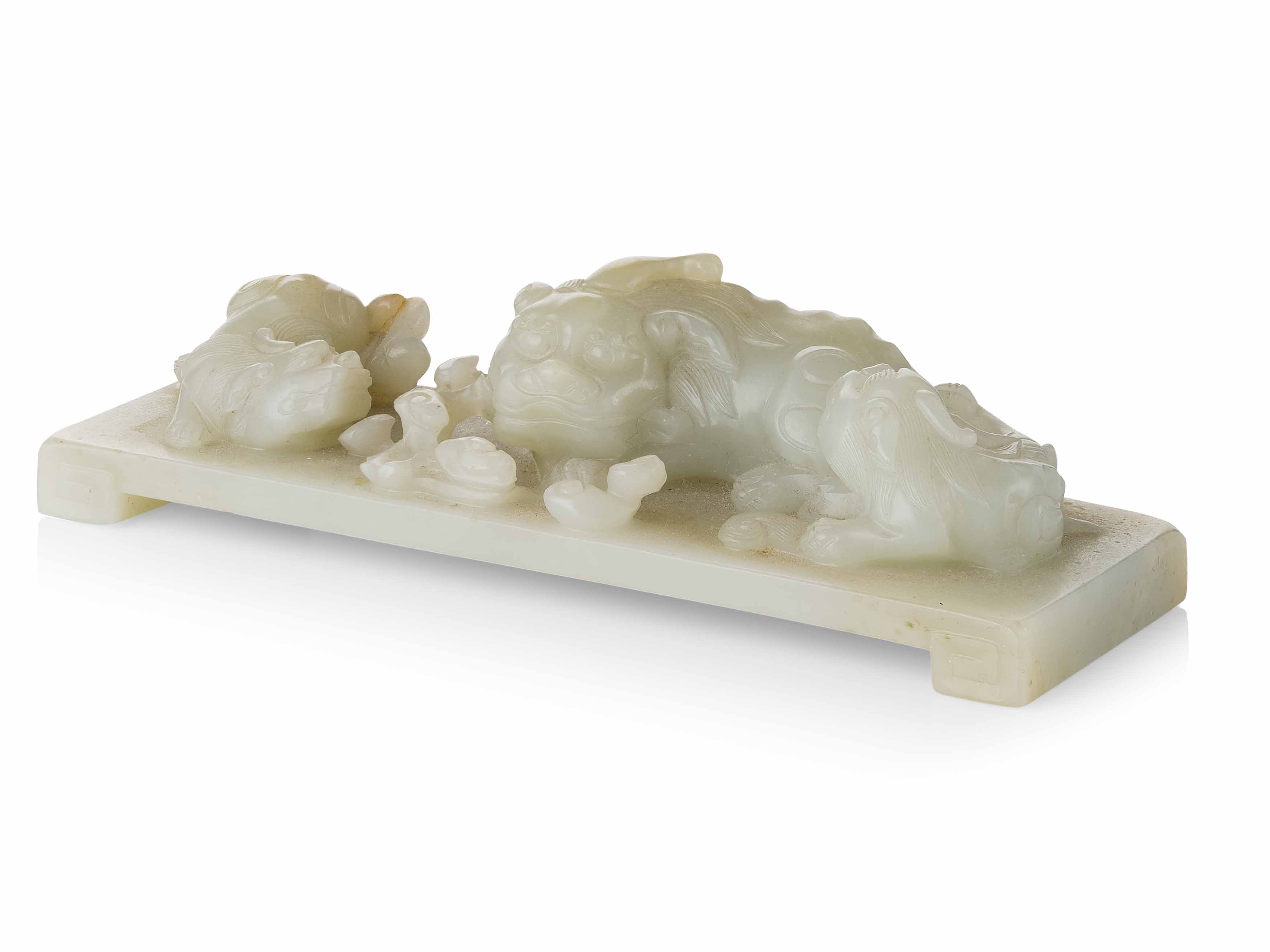 CELADON JADE CARVING OF A BUDDHIST LION AND TWO CUBS