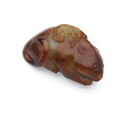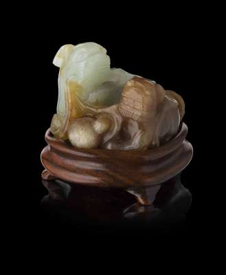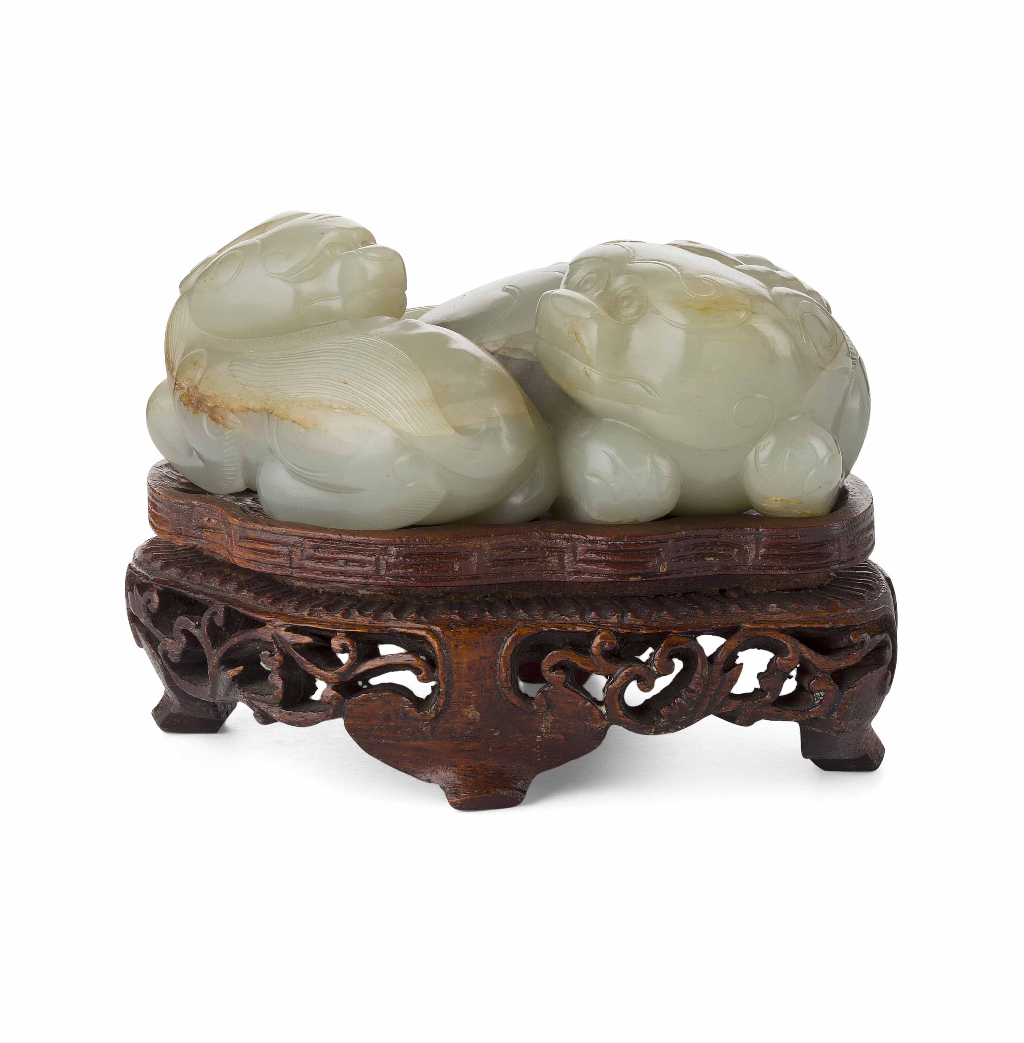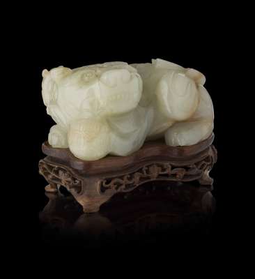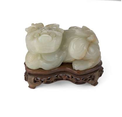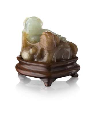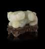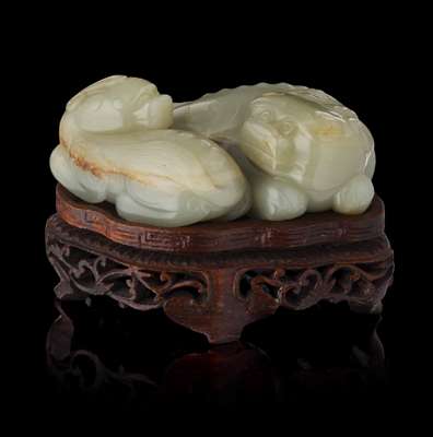 comprising; a carving of a Buddhist lion, on hardwood stand, 8 cm long; another of a single-horned mythical beast and young, on hardwood stand, 10cm long; and a celadon and brown carving of two Buddhist lions, on hardwood stand, 3.5cm tall (excluding stand); and another russet jade carving of a mouse, with a chilong resting on its back, 7.5cm long (4)