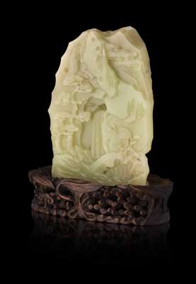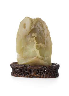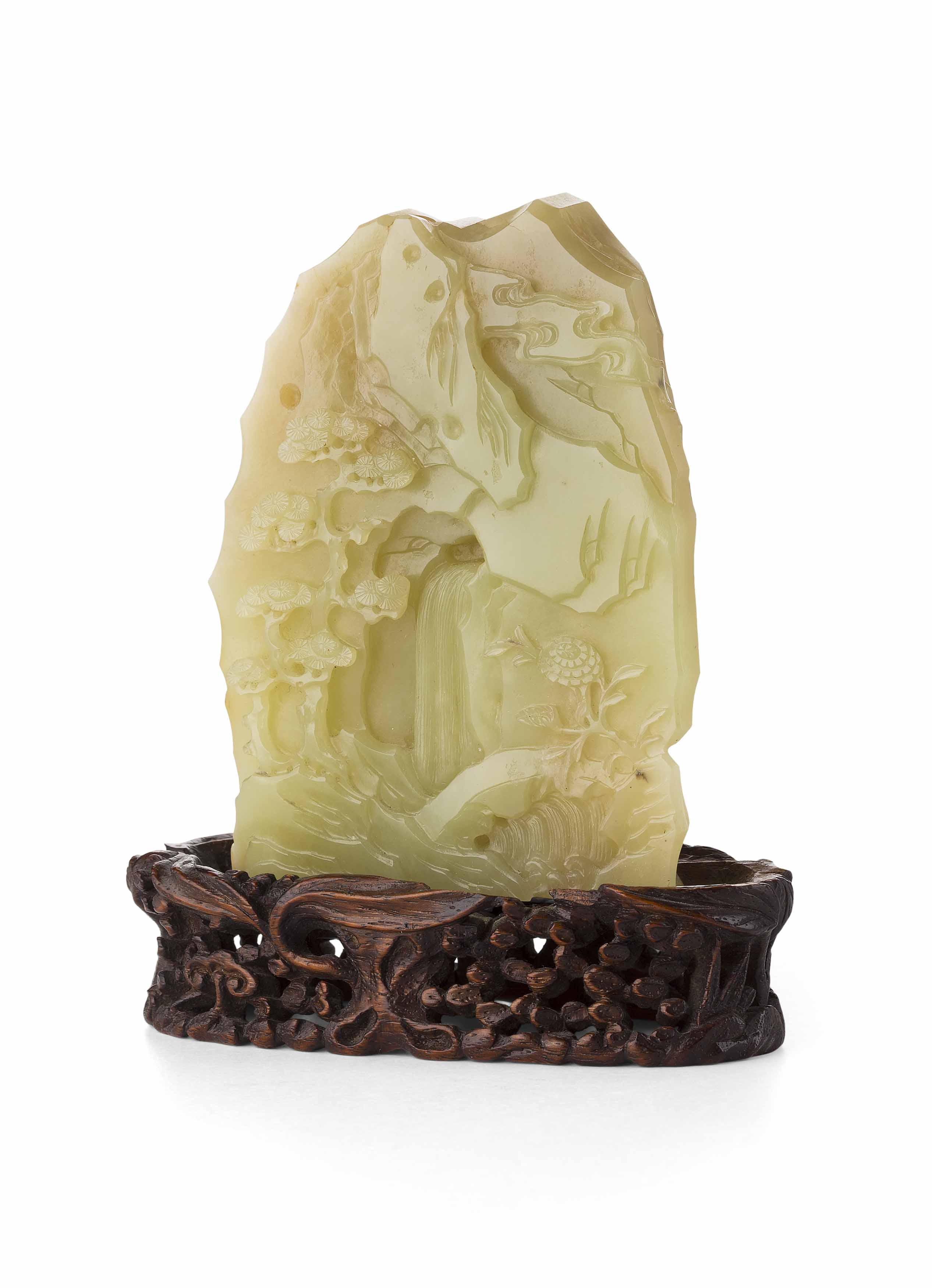 carved in the shape of a rock with grottos, waterfalls and clouds, prunus trees and a branch of chrysanthemums, on carved hardwood stand