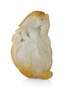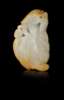 the head looking forward with scrolling tail and well carved hair, the stone of celadon tone with russet markings