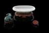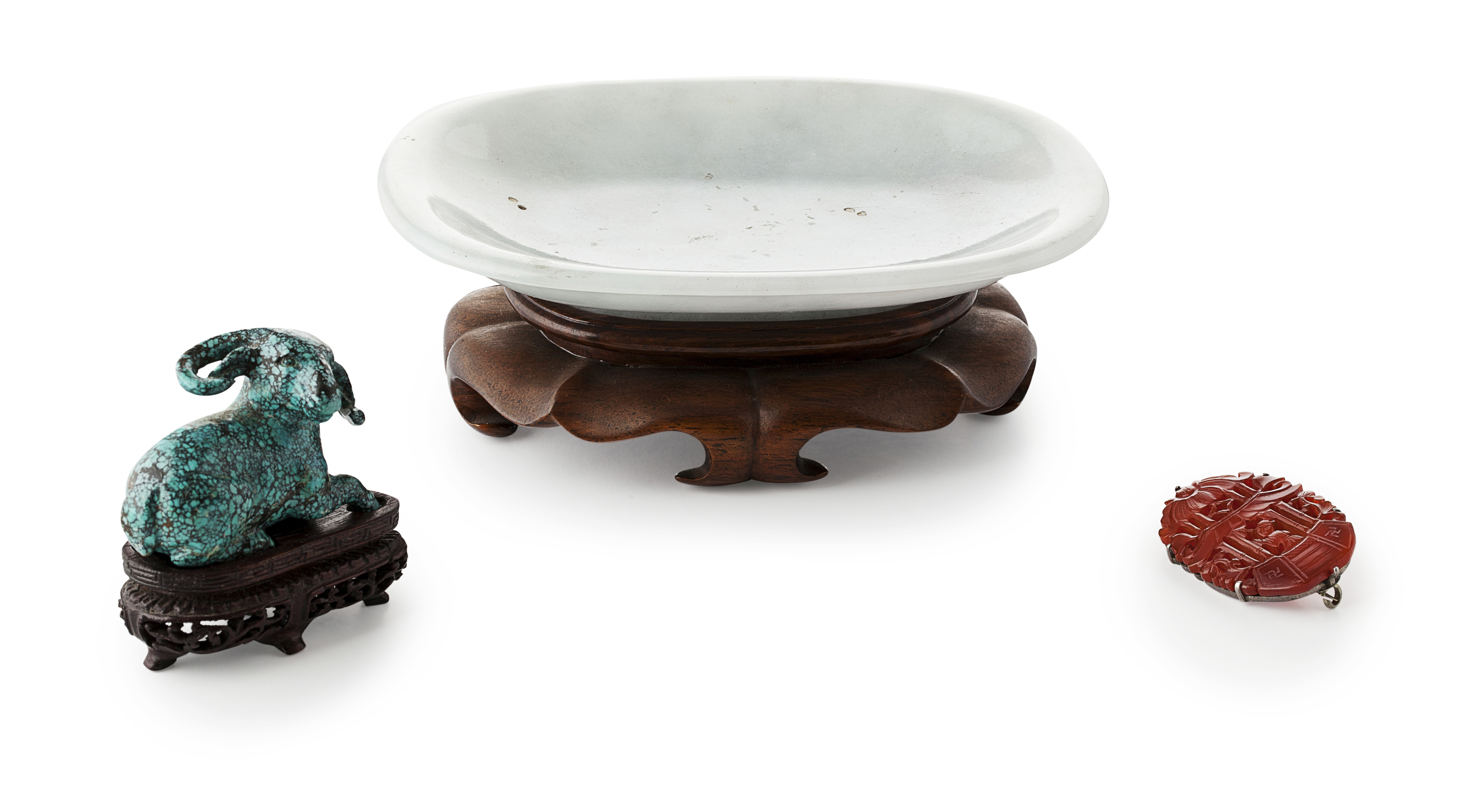 the stone of pale celadon tone, on footrim, 15.5cm long; together with a TURQUOISE MATRIX CARVING OF A RECLINING RAM, with fitted wooden stand, 5.5cm long; and an AGATE OPENWORK BROOCH, carved in the form of a figure in a pagoda with lotus roof, the stone of honey brown tone, mounted in metal, 5cm long (3)