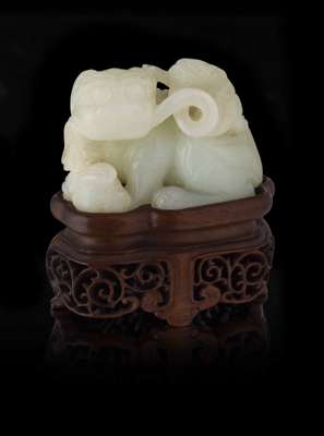 the recumbent animal carved with a brocade ball in its front paws, a ribbon in its mouth, and a cub crawling on its back, on wood stand