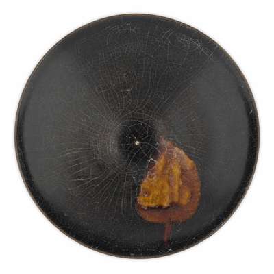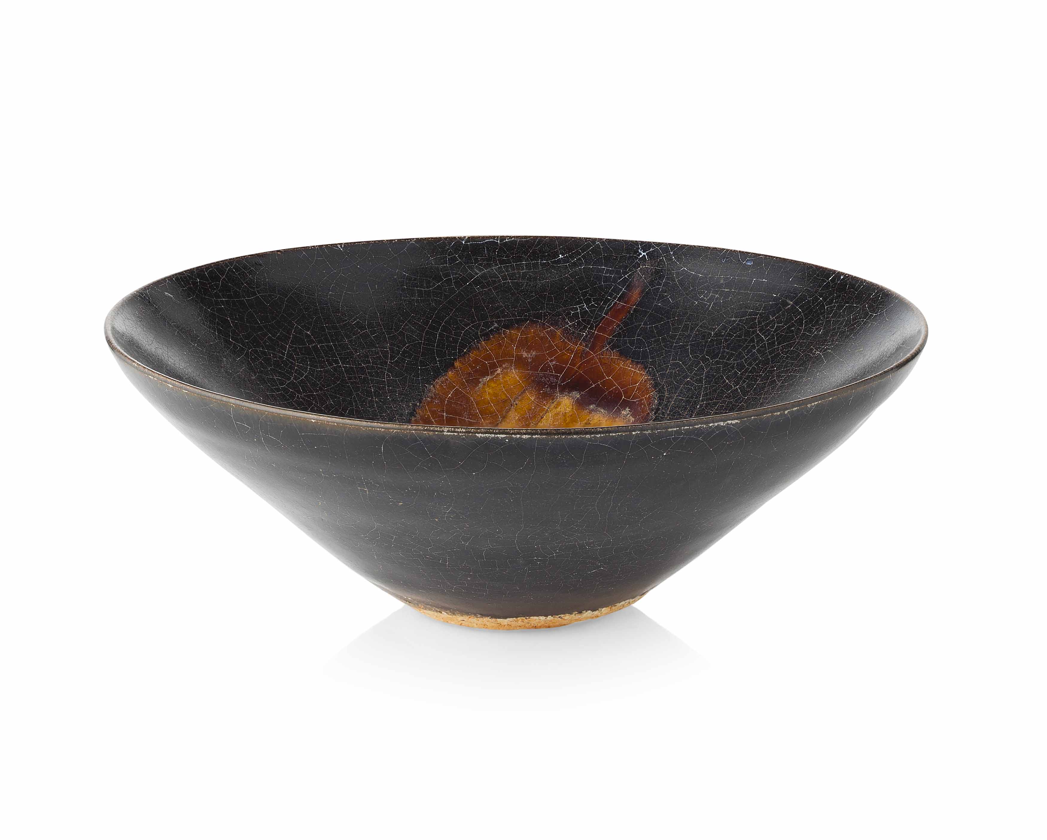 the flared sides covered in a thick dark crackled glaze stopping short of the foot, the interior bearing the imprint of a large leaf of brownish colour