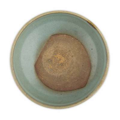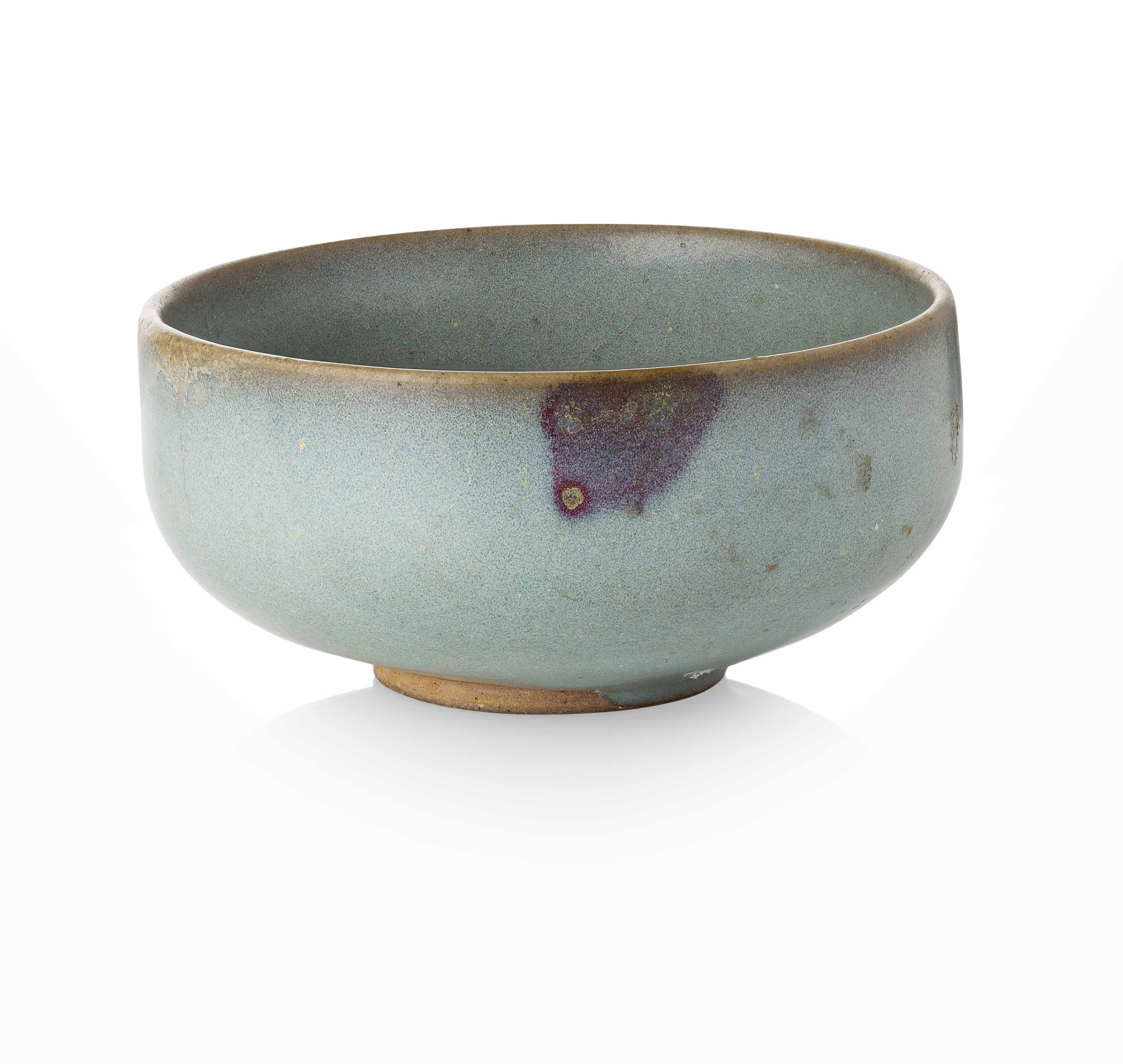 of flattened globular form, the rounded sides glazed to the interior and exterior with a lavender blue glaze, thinning to an olive hue to the rim, with three purple splashes to the exterior, the central section of the interior and foot unglazed