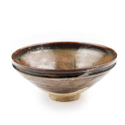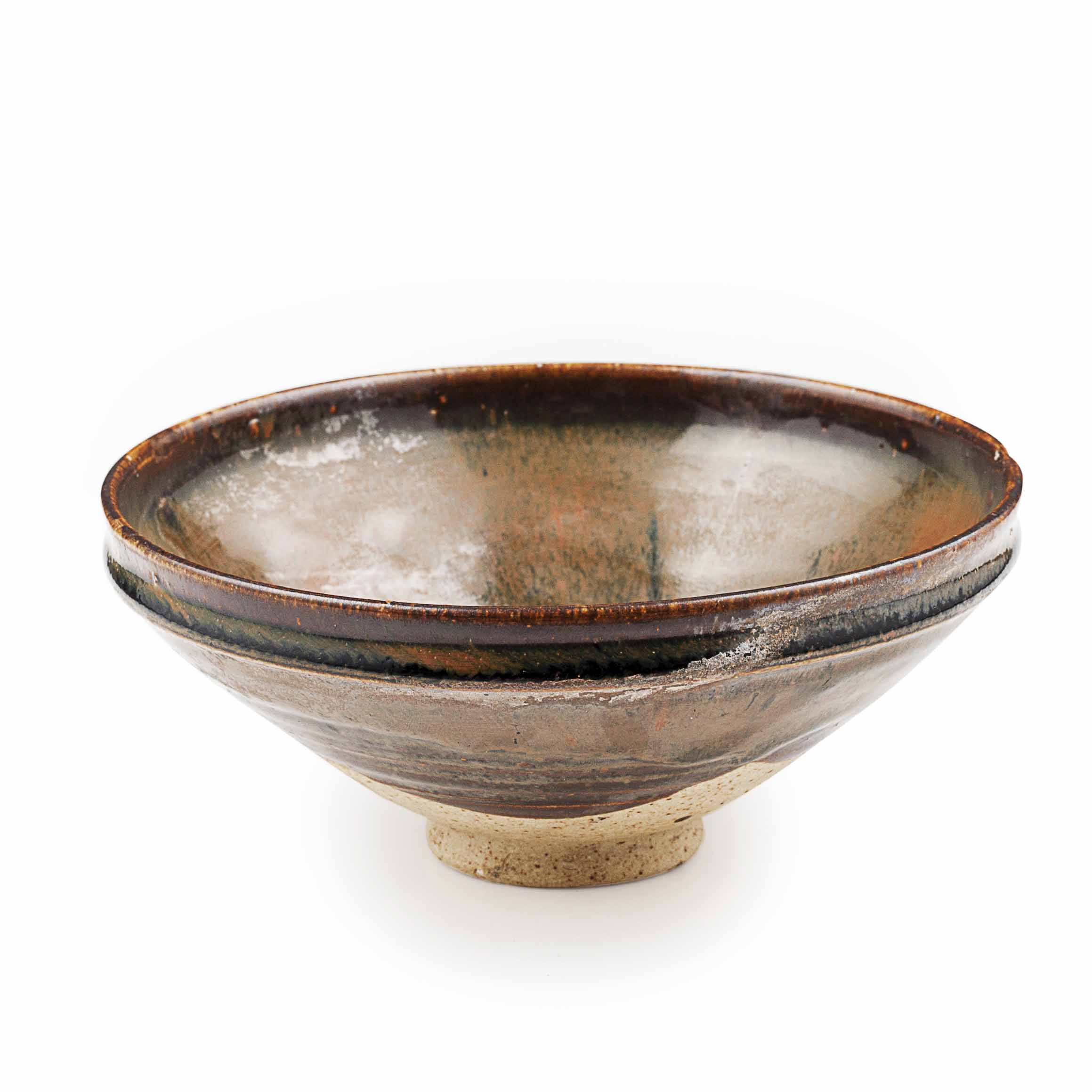 the rounded sides covered to the interior and exterior in rich brown glaze streaked with russet 'hare's fur' markings, the glaze ending on the exterior in a thick line above the foot to expose the brown ware