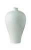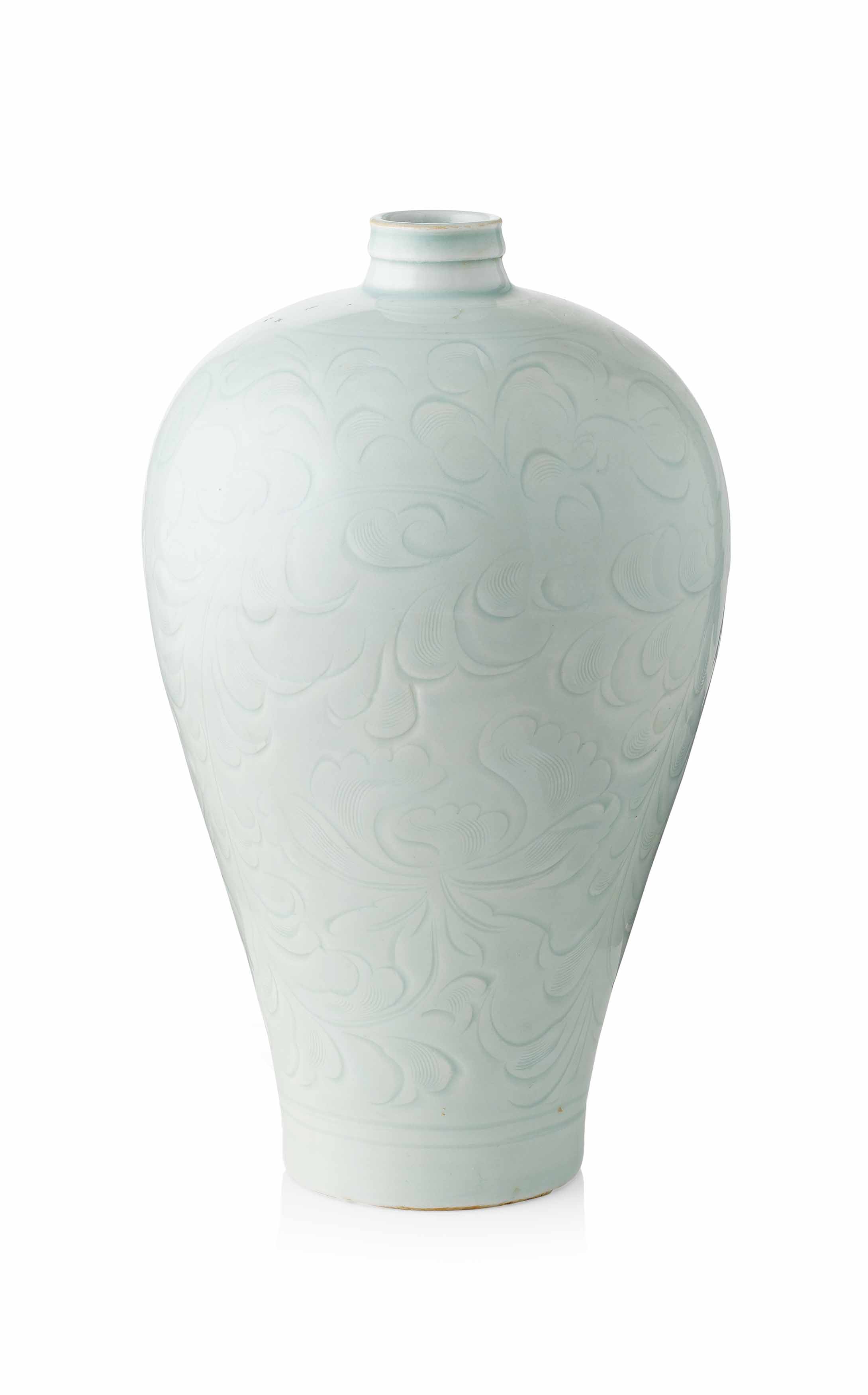well potted with a long slender body rising from the base to rounded shoulders, surmounted by a ribbed neck, carved on the exterior with scrolling tendrils, the glaze of pale aquamarine tone