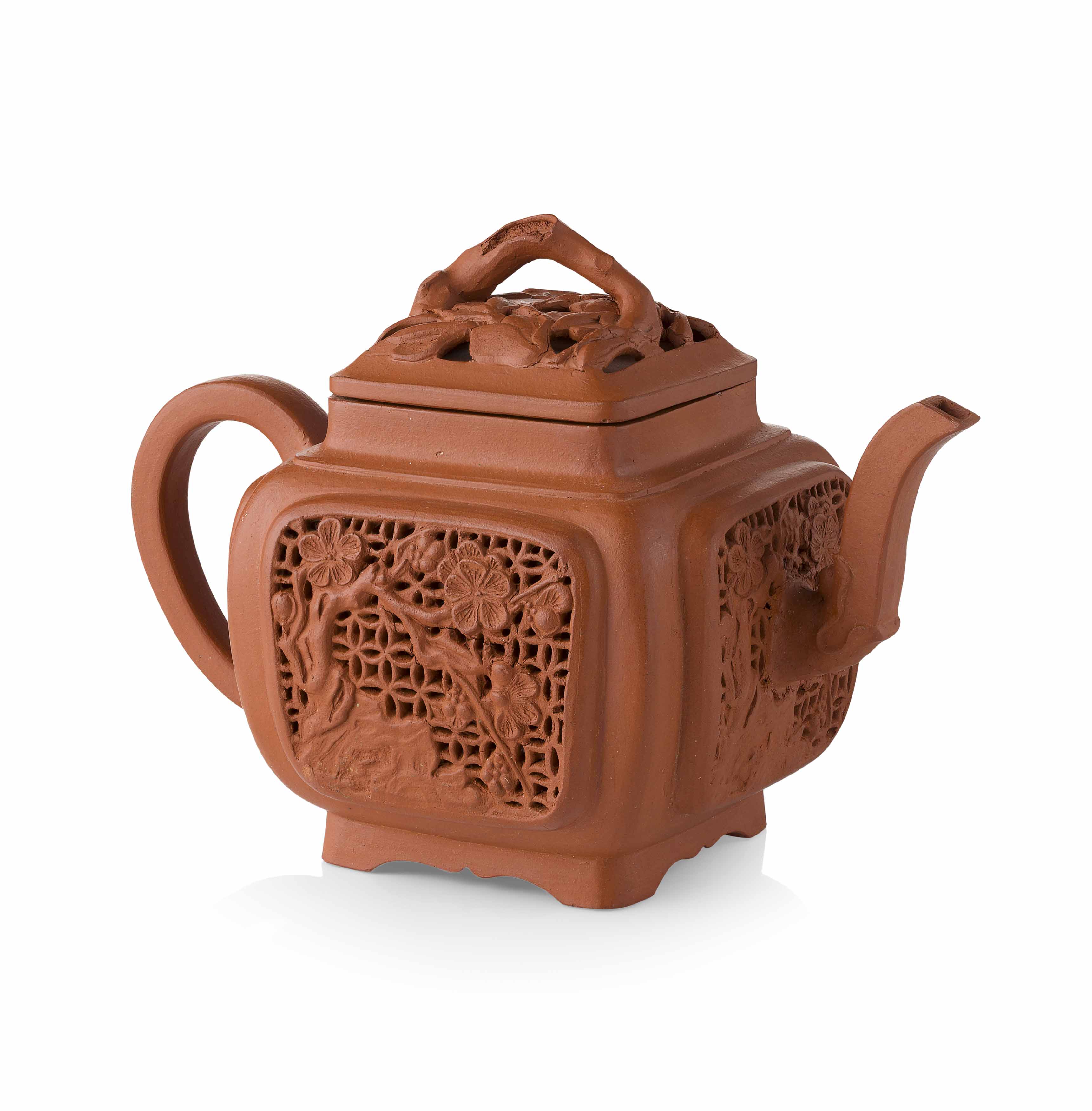of square form, each side decorated with a blossoming prunus tree on pierced cash diaper ground, the cover decorated with leaves, the handle moulded in the shape of a branch