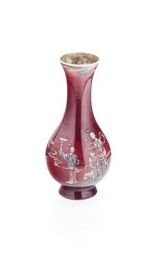 with flared neck, later decorated in famille rose enamels with two ladies amongst clouds, one in a dancing pose holding a fan, attended by a young boy