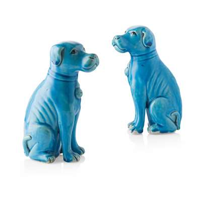 each realistically modelled seated on its haunches, the front legs straight and head erect and slightly turned to one side, the tail curved over the back legs, wearing a collar with a double gourd-shaped pendant, covered in rich turquoise-blue glaze (2)