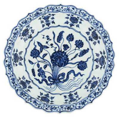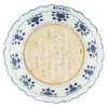 the central medallion painted with composite floral blooms within a shaped panel of double lines, with ten detached floral sprays repeated on the exterior, the mouth rim with a band of floral scroll within double line borders, the base unglazed and with inscription