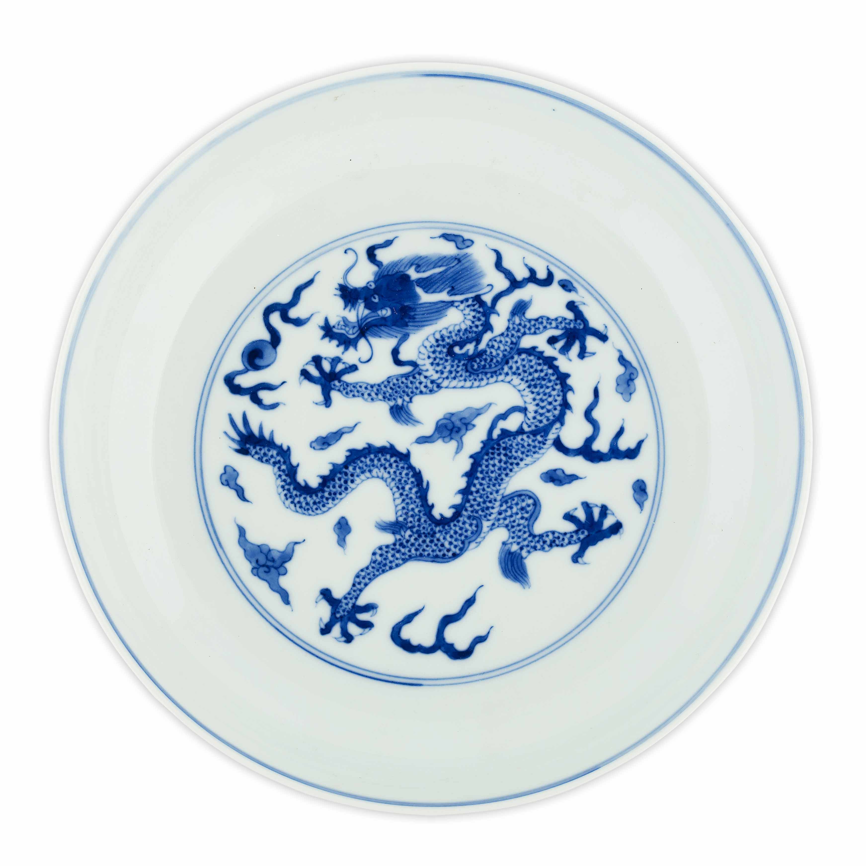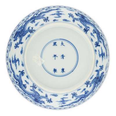 of shallow form, decorated to the interior with a five-clawed dragon chasing the flaming pearl amongst swirling clouds within a double ring, the rounded sides decorated to the exterior with further dragons amongst floating clouds, Kangxi six-character mark within a double ring to the base