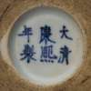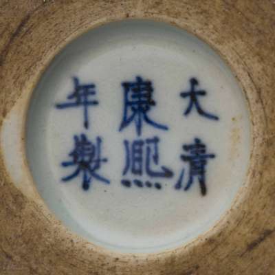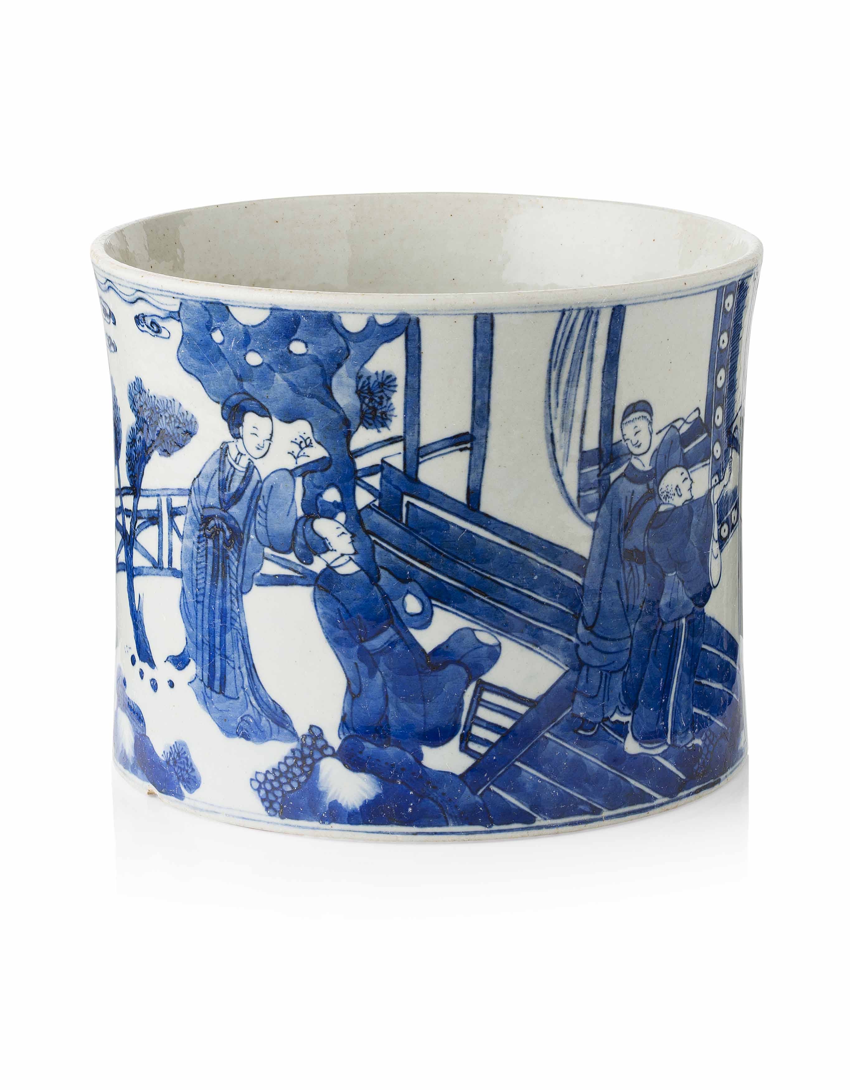 of broad cylindrical form, the exterior finely painted in different shades of underglaze-blue with two framed scenes depicting the leisure life of court ladies in a pavilion and in a garden, the base with six-character Kangxi reign mark