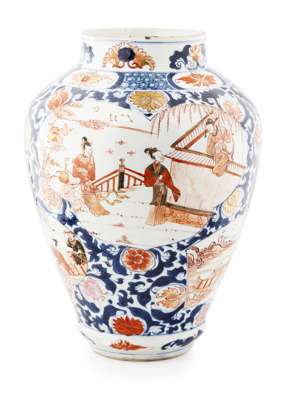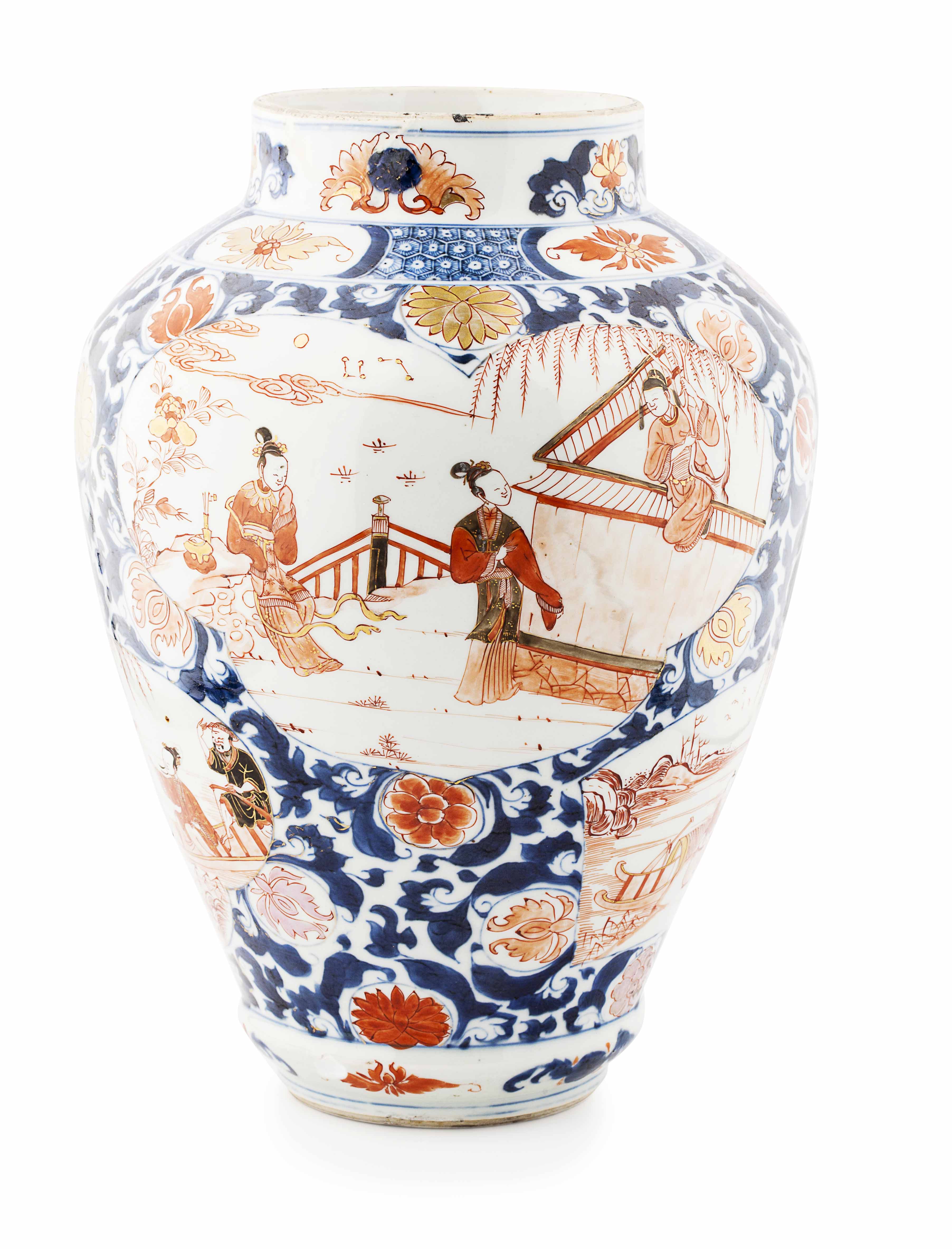 of ovoid form, decorated with four shaped reserves with various scenes, one with ladies playing Go in a fenced garden beneath plumblossoms, another with a man climbing the palace wall to impress two ladies, another with two ladies sailing on a river, and the last depicting four fishermen feasting on the shores, all on a ground of lotus and peonies within roundels amongst scrolling leaves, the shoulder with floral diaper border and further lotus flowerheads
