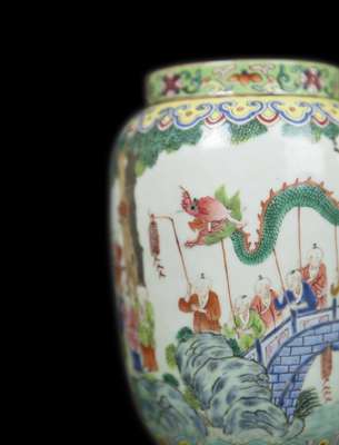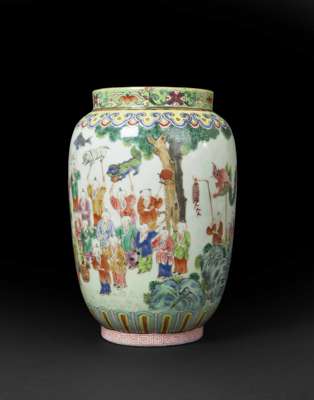 of oval form, the body painted with a continuous festival scene of boys at play, some carrying flags, others carrying animal banners and riding hobby-horses, a group performing the dragon dance over a bridge, the footring decorated with keyfret border and lappets, the shoulder with ruyi border, the neck with flowerheads on lime-green ground, iron red seal mark to the base
