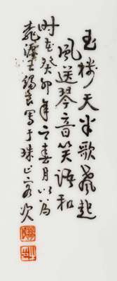 each depicting a pair of court ladies in a garden, the first pair playing Go, the second looking into the landscape, each signed, inscribed with a poem and dated the year 'guimao' (1963), with wood frame (2)