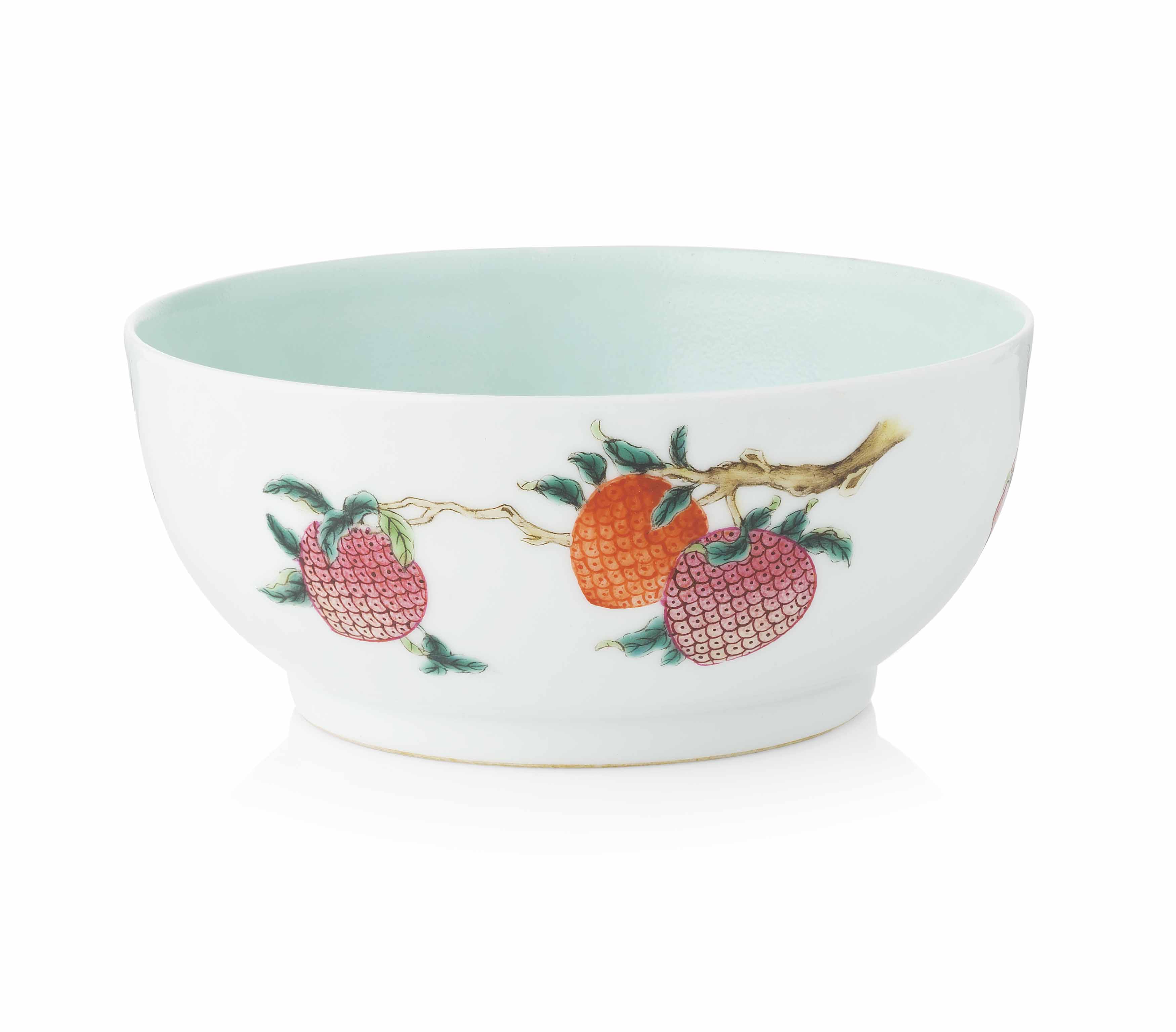 the exterior colourfully decorated with the Three Abundances, ripe peaches, pomegranates and lychees hanging from leafy branches, the interior and base pale turquoise glazed, the base with a six-character Daoguang mark