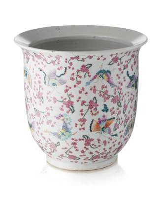 the tall rounded sides and flared rim decorated to the exterior with a profusion of butterflies amongst plumblossoms