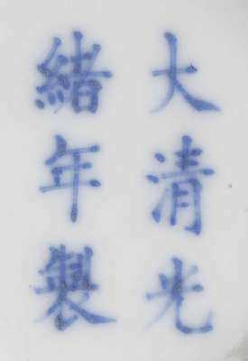 each decorated to the exterior with the auspicious Baobao (eight treasures) symbols above a ruyi-head border encircling the raised foot, the recessed base bearing six-character Guangxu mark in underglaze blue (2)