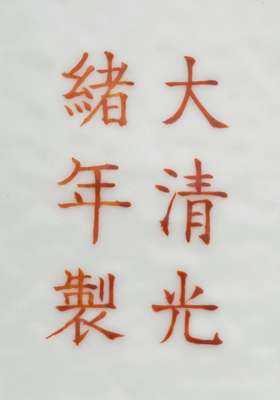 decorated with butterflies in different colours between bands of ruyi encircling the mouth, lotus and shou characters on the shoulder and flower petal lappets around the base, six-character mark in iron-red to the base