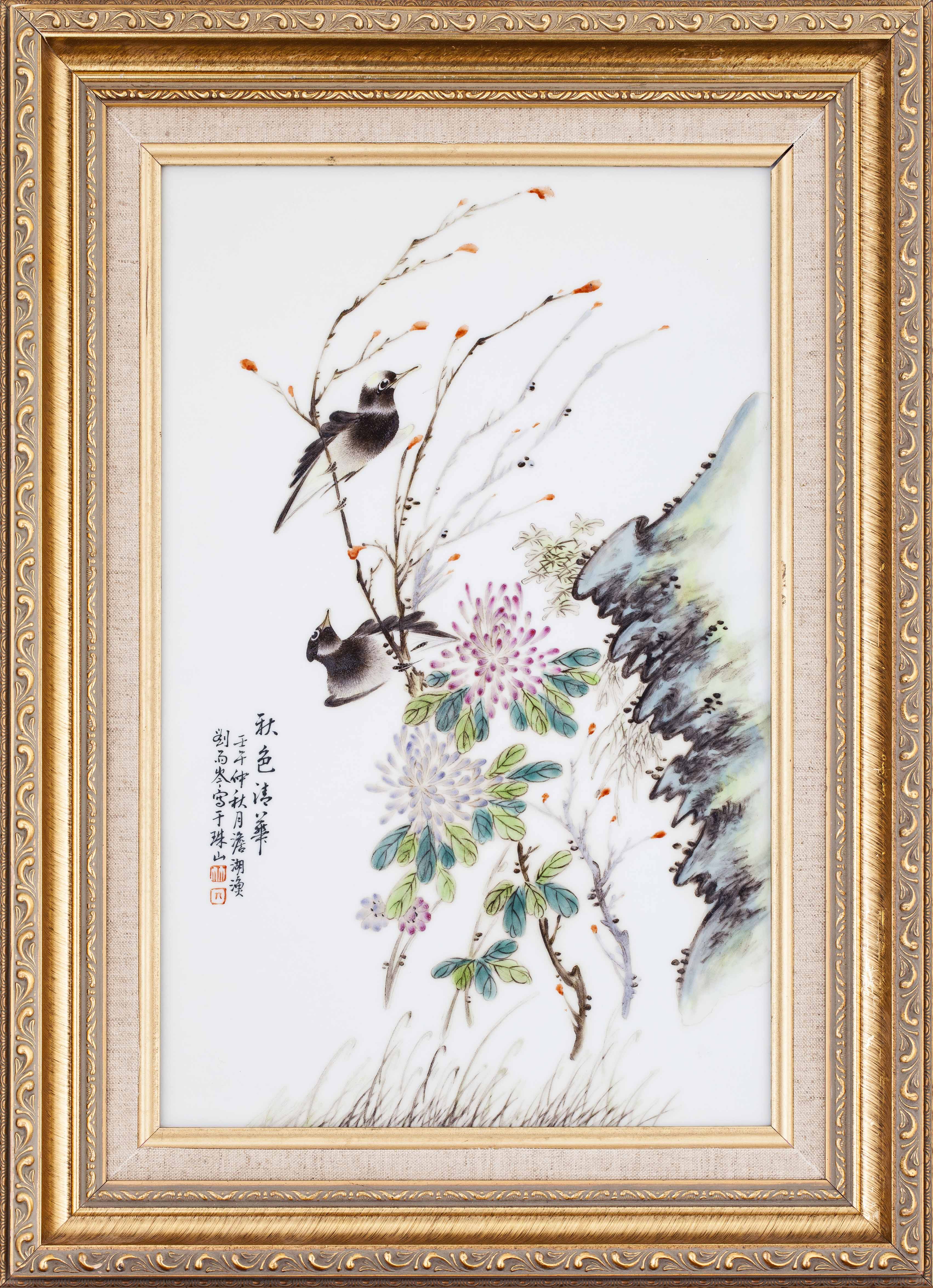 vividly enamelled in shades of blue, green, pink and yellow with two birds perched on branches amid blossoming chrysanthemum sprays, signed Liu Yuqin and dated 1942 on the left, framed and with two seals