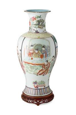 decorated with a court scene, the emperor and attendants around a table with officials and scholars nearby, and a group of ladies playing music in the background, the foot with lappet border, the shoulder with a floral and leaf pattern, the neck decorated with two large peonies, rocks and a wild beast